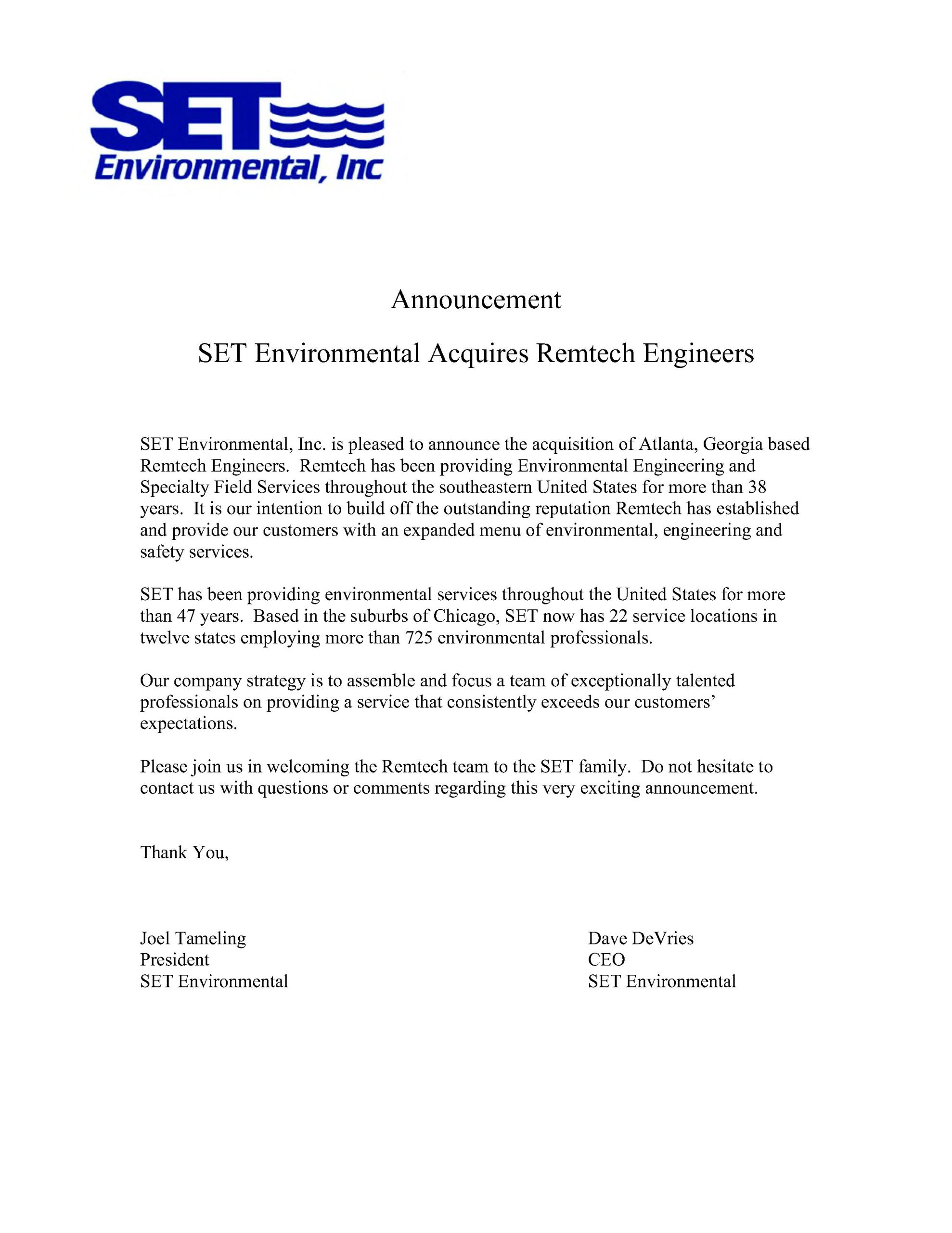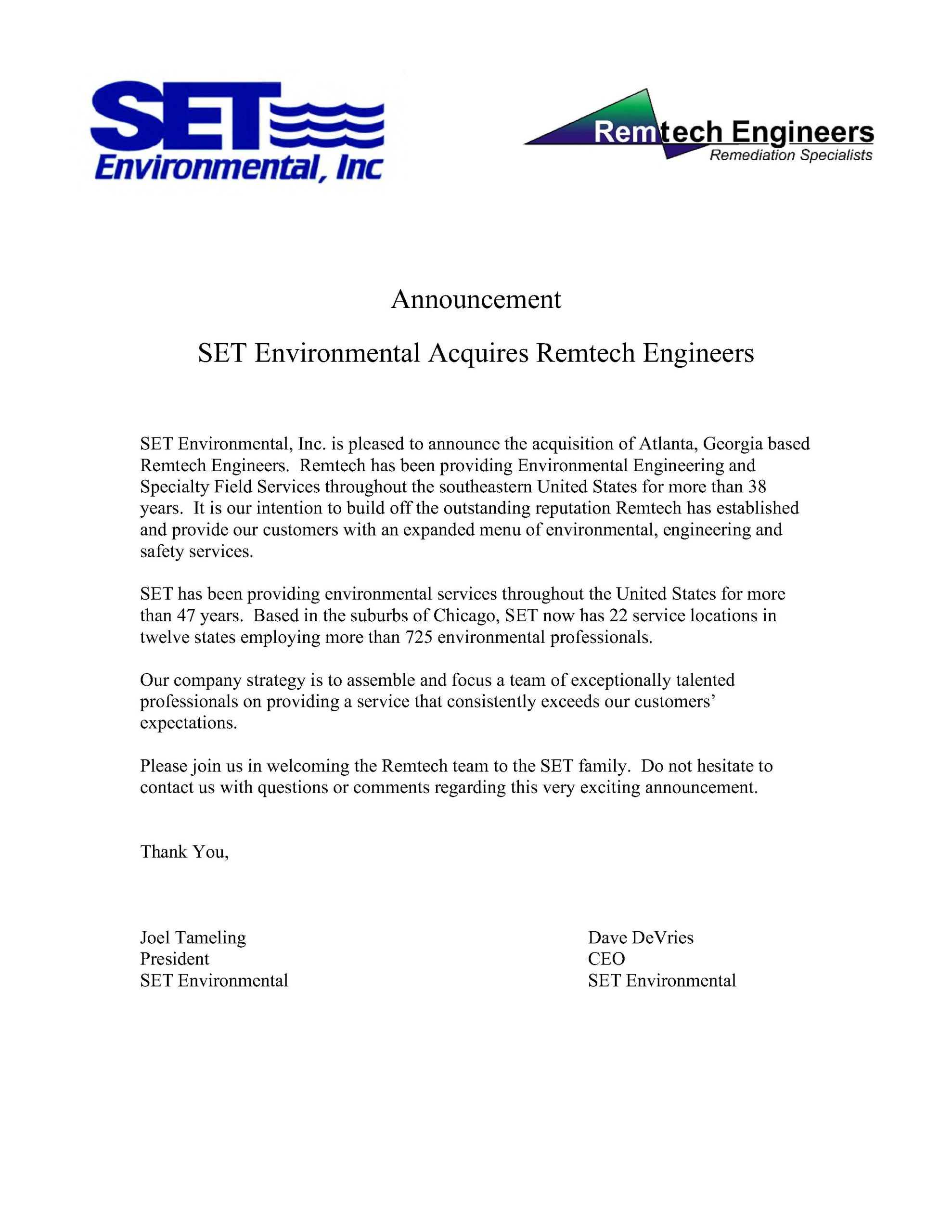 At SET we understand that to be successful it takes hard work, persistence, and an understanding of our client’s needs. This understanding, combined with our tradition of integrity and technical expertise, makes SET your valued partner in environmental management.